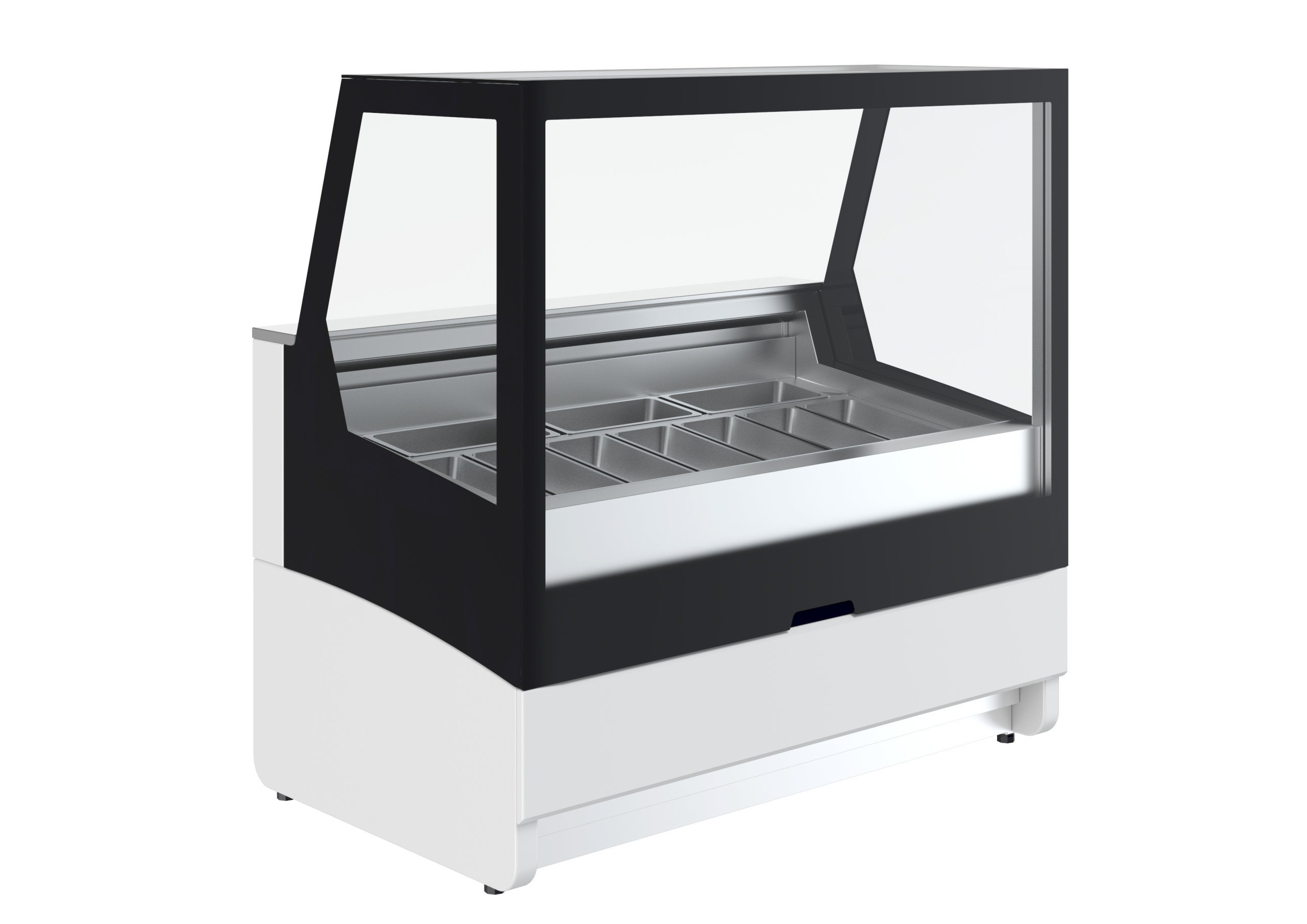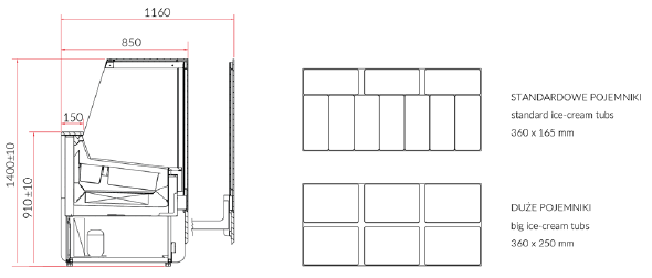 - przestrzeń ekspozycyjna z blachy nierdzewnej przygotowana pod pojemniki 165 x 360 mm (10 smaków)
