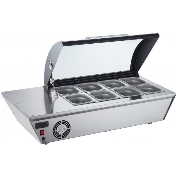 Witryna chłodnicza z przeszklona, uchylną pokrywą przeznaczona do efektownej prezentacji towaru. Wydajny system obiegu powietrza zapewnia równomierny rozkład temperatury we wnętrzu urządzenia. Urządzenie o pojemności 8x GN 1/6 bądź 4x GN 1/3.