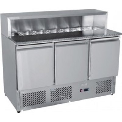 3-drzwiowy stół chłodniczy ESL z agregatem na dole wykonany ze stali nierdzewnej, przystosowany do pojemników gastronomicznych GN1/1. Urządzenie doskonale nadaje się do różnego rodzaju punktów gastronomicznych tj. restauracje, pizzerie, bary, fast-food’y, puby itp.