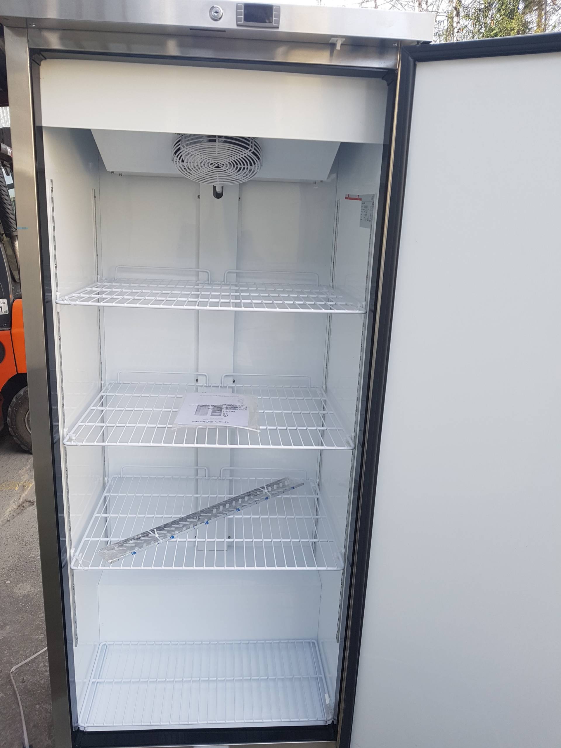 Szafa chłodnicza SR40VS o pojemności 380L wykonana jest ze stali nierdzewnej. Posiada wymuszony obieg powietrza, elektroniczne sterowanie i termostat, możliwość zamknięcia na klucz oraz 2 kółka jezdne (z tyłu).