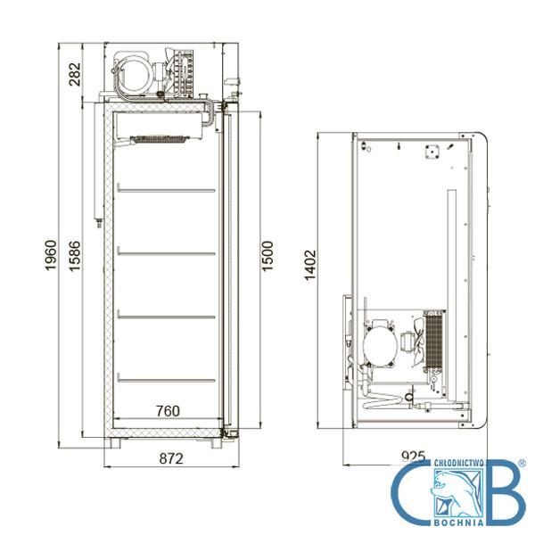 Gastronomiczna szafa mroźnicza o pojemności 1400 litrów z agregatem umieszczonym u góry, przystosowana do pojemników gastronomicznych GN 2/1. Wyposażona jest w chłodzenie nawiewowe (wymuszone wentylatorem) oraz automatyczne odszranianie i odparowywanie skroplin. Obudowa oraz wnętrze szafy wykonane są ze stali pokrytej polimerem.