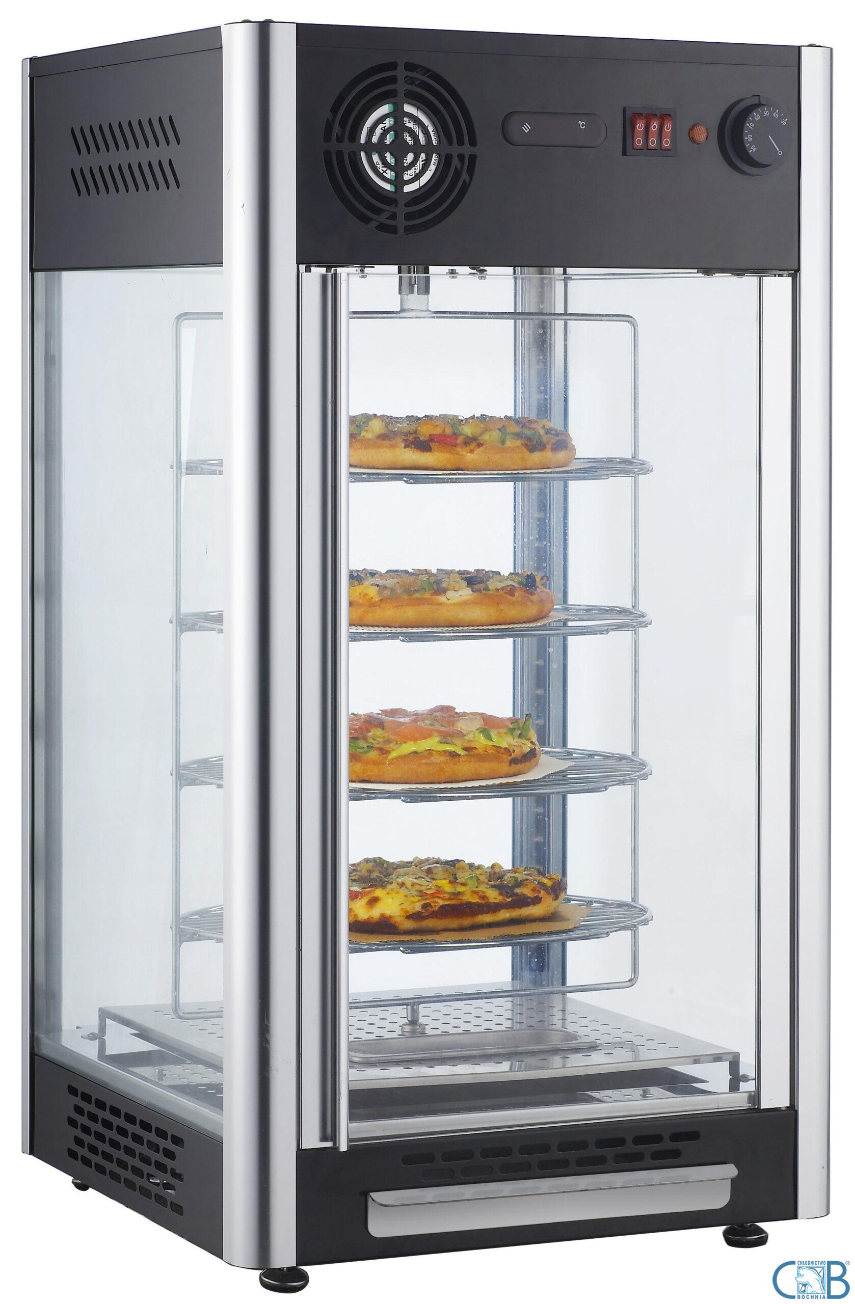 Profesjonalna witryna grzewcza ekspozycyjna o pojemności 108L. Wyposażona jest w 4 obrotowe półki (ruszty). Urządzenie posiada oświetlenie, oraz wymuszony obieg powietrza. Idealnie nadaje się do ekspozycji ciepłych potraw w restauracjach, kawiarniach, barach, oraz placówkach zbioroweg żywienia.